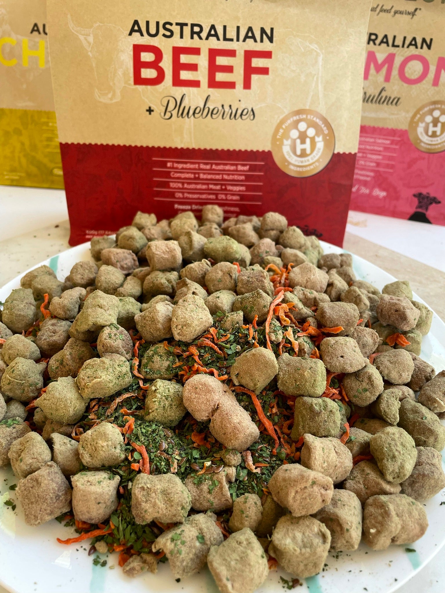 Designed by our Founder, Emma and formulated by Australia’s leading animal nutrition expert, all of our dog food features human grade, Australian meat or fish as the #1 ingredient combined with diced veggies and superfoods.