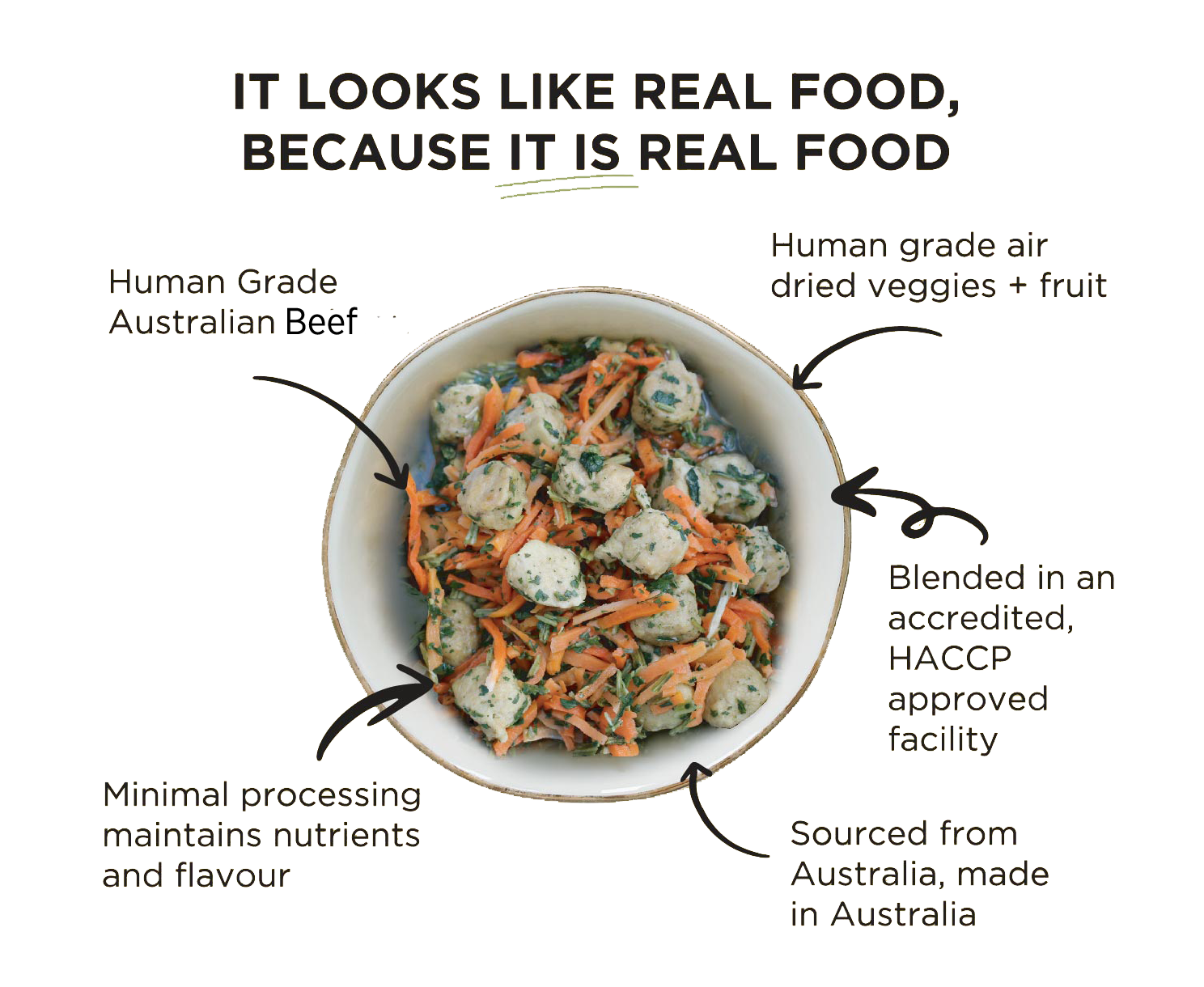 Our deliciously nutritious 100% human grade ingredients - yup Aussie beef is the #1 ingredient and it's single protein!