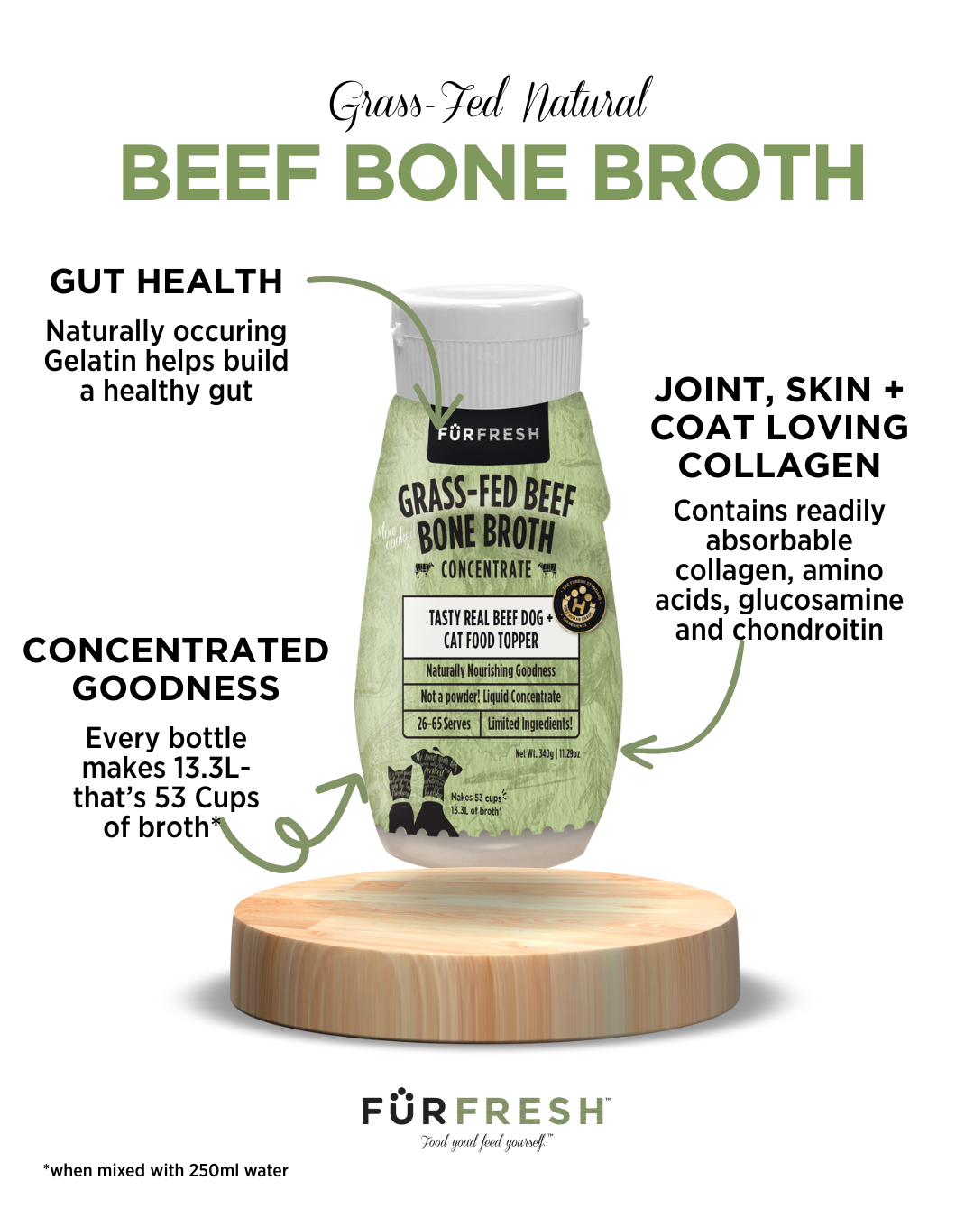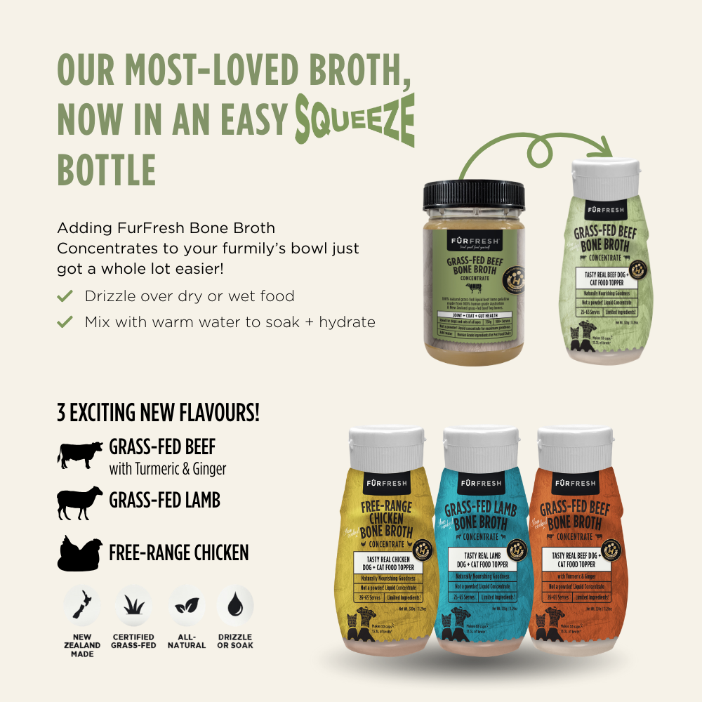 FurFresh Bone Broth Concentrates are the quick, fun and fuss-free way to add goodness to your furmily’s meals. Packed with real nutrition and bursting with flavour, they’ll be licking the bowl clean.