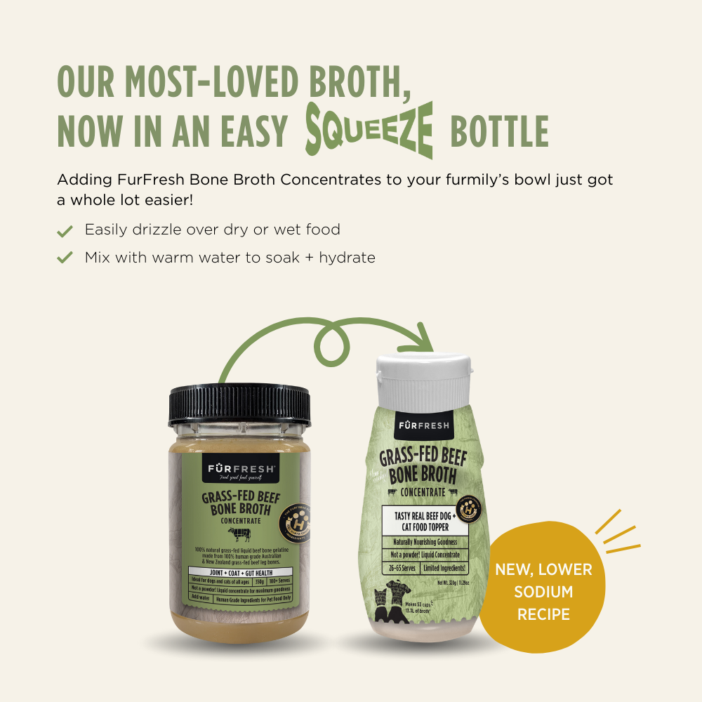 For fans of our OG Grass-Fed Beef Bone Broth in the jar - our new squeeze beef bone broth concentrate is 99% the same! Still the most concentrated, nutrient rich bone broth there is! The only small change has been some apple cider vinegar and a teeny bit more purified water to help make sure that it squeezes out nicely even after it has been in the fridge. Your furmily will absolutely still be giving this the lick of approval.